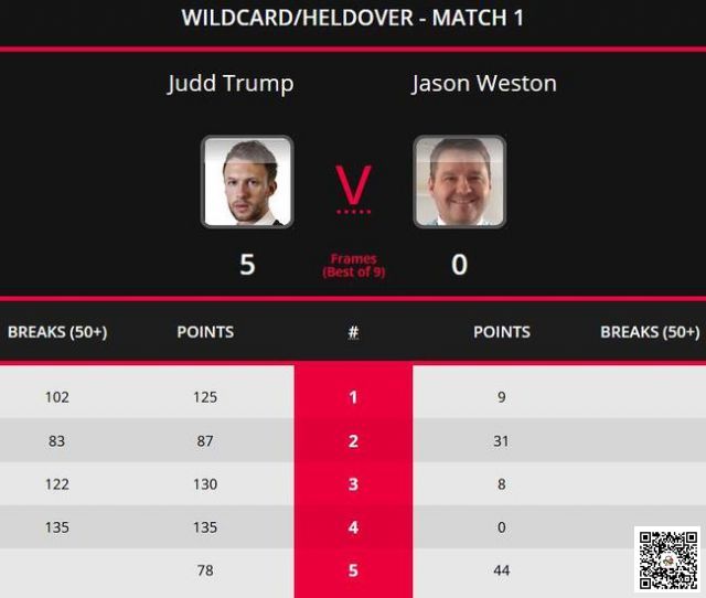 同时开始但较早结束的另一场延时资格赛由卫冕冠军特鲁姆普对阵排名第124位的杰森-韦斯顿,特鲁姆普手感火热直落五盘赢得比赛,前四局特鲁姆普先后打出单杆102分、83分、122分和135分取得4-0领先拿到赛点,第五局特鲁姆普在与对手耐心周旋后以78-44锁定胜局,比分定格在了5-0,特鲁姆普晋级正赛,将与名不见经传的阿什利-赫吉尔争夺32强席位,继续晋级的希望极大。
